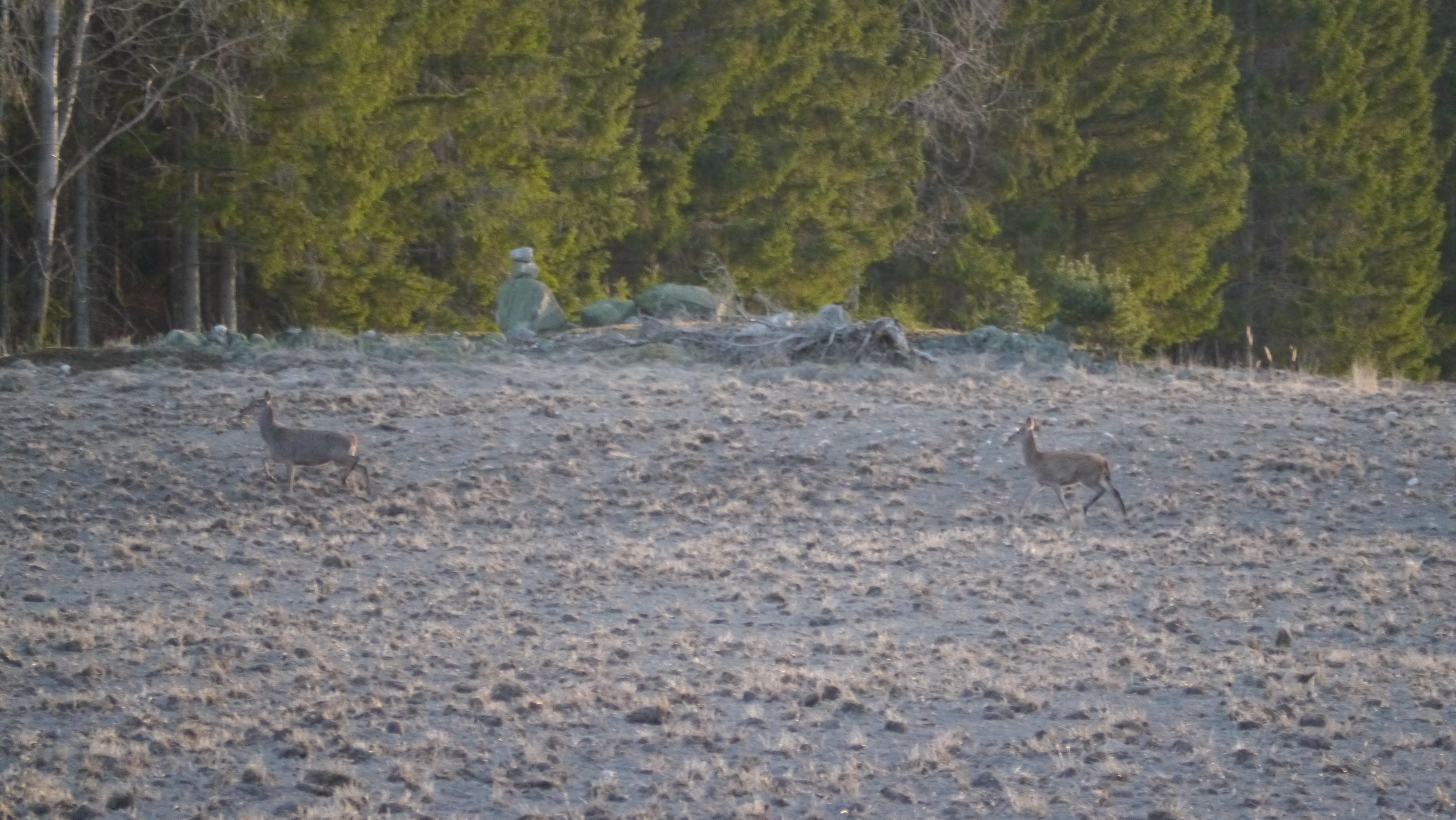 En tisdag mitt i arbetsveckan i slutet av april smyger jag mig ut på fälten där det finns fina inslag av grönare smattar blandat med plöjda och harvade delar. Sätter mig längre ned på ett fält bredvid en hög med gamla balar och ett  krondike med några övergångar där djuren behöver passera för att komma till det gröna. På vägen ut skrämmer jag både en fin råbock och en stor rödräv. Jag sitter från en timme innan solens nedgång och en kvart efter utan att se nåt, däremot hör jag en gris grymta bakom mig, Efter en kvart till misstänker jag att han grymtar pga att den fått vind så jag börjar långsamt gå inåt fältet för att se vad som finns mer norrut. Jag hinner bara 150 m då jag vid en rundspaning i kikaren får se en årsgris som ganska lungt joggar ut där jag nyss stått med riktning mot det gröna, j..ar jag skulle suttit kvar! Den kommer ut på 150 m och småspringer, inte alls nåt bra skjutläge på en gris så jag inväntar att den skall stanna vilket den inte gör förrän kort å¨200 m och sen på 250 m i hörnet av ett fält. Det finns inget att ta skydd bakom så jag gör ett försök fullt öppet ta mig närmare men långsamt, men den märker mig ganska snart och försvinner med ett rasslande spår bakom sig av jägarbesvikelse. Försiktigt går jag vidare och inte mindre än nån minut senare får jag syn på en svart knöl i kanten bara några hundra meter norrut på samma fält.
