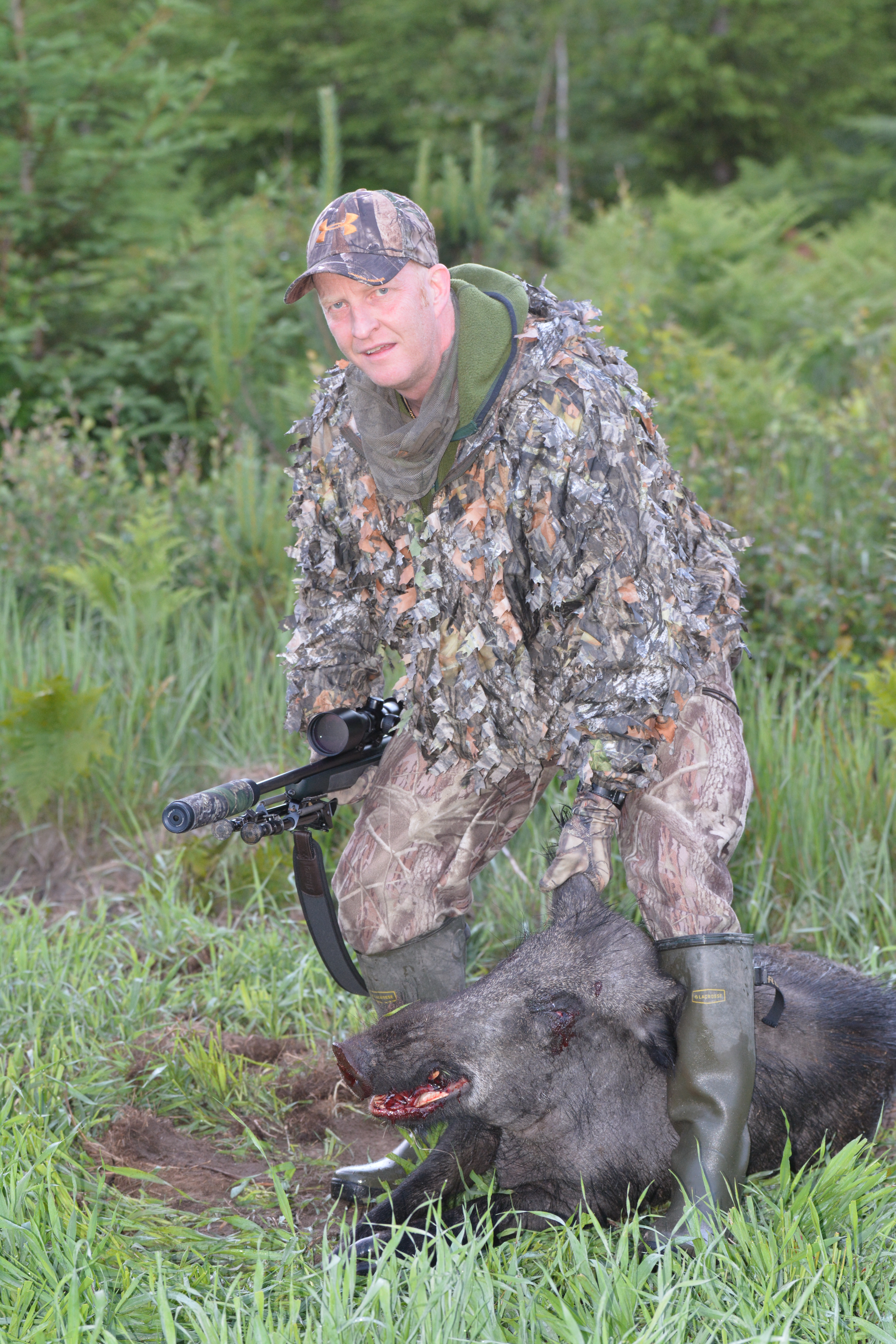 Jag var på väg från Örebro och kom förbi två handfallna bilister halvt chockade med en kniv i handen och en väldigt levande med skadad Dovhjort mitt på vägen strax före Katrineholm. Jag stannar och erbjuder förstås min hjälp till vilket dom är tacksamma för, precis när jag ska ta kniven och gå fram och avfånga så reser den dock på sig men blir helt stilla stående på benen i diket, inte möjlig att ta med en kniv m.a.o, som tur har jag hela jaktgarderoben i bilen. Jag hämtar mitt vapen, laddar och fångar av den säkert i diket utom synhåll från någon bilist som kan bli skrämd eller rapportera oss för djurplågeri (ja…det har hänt)