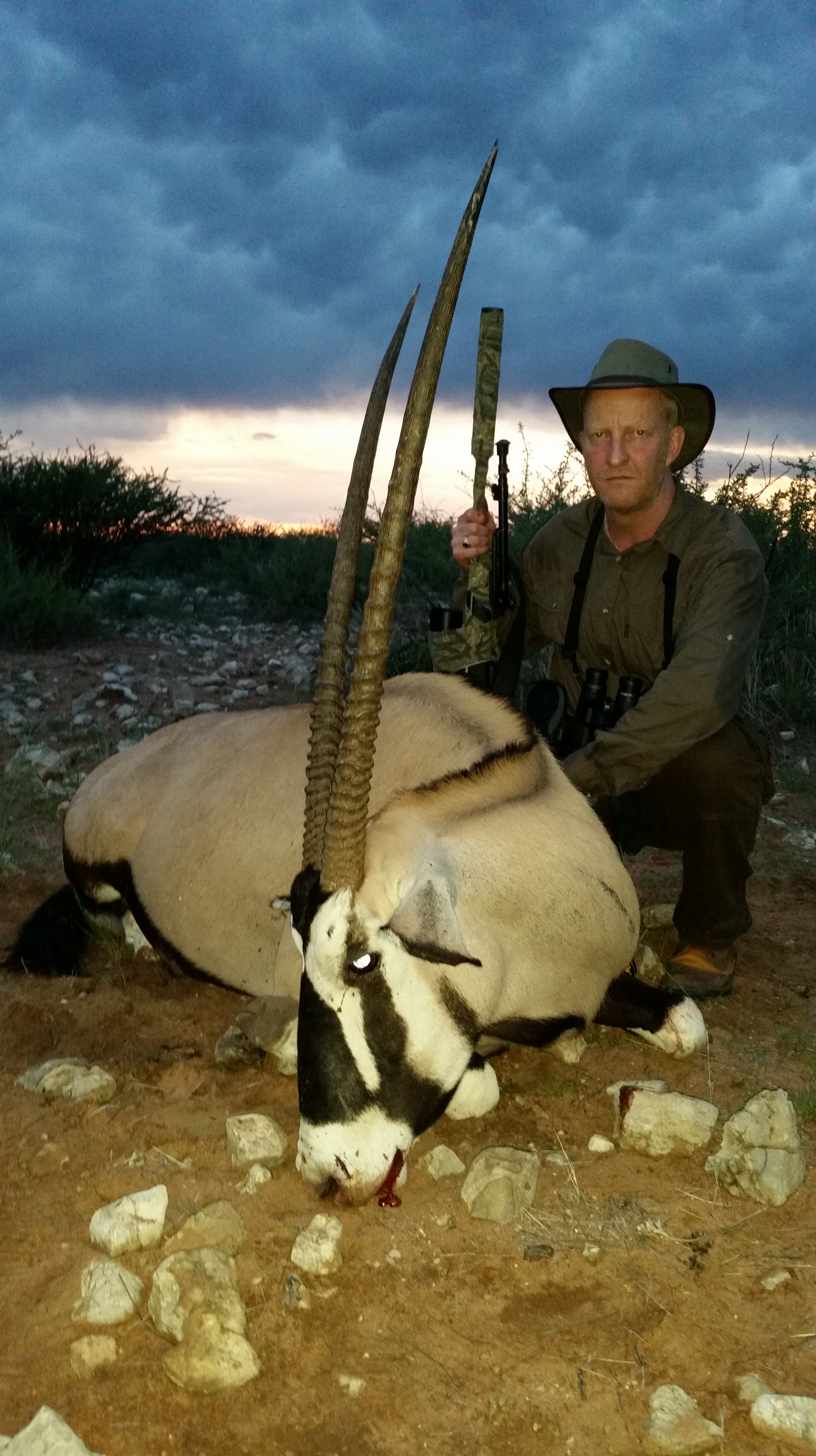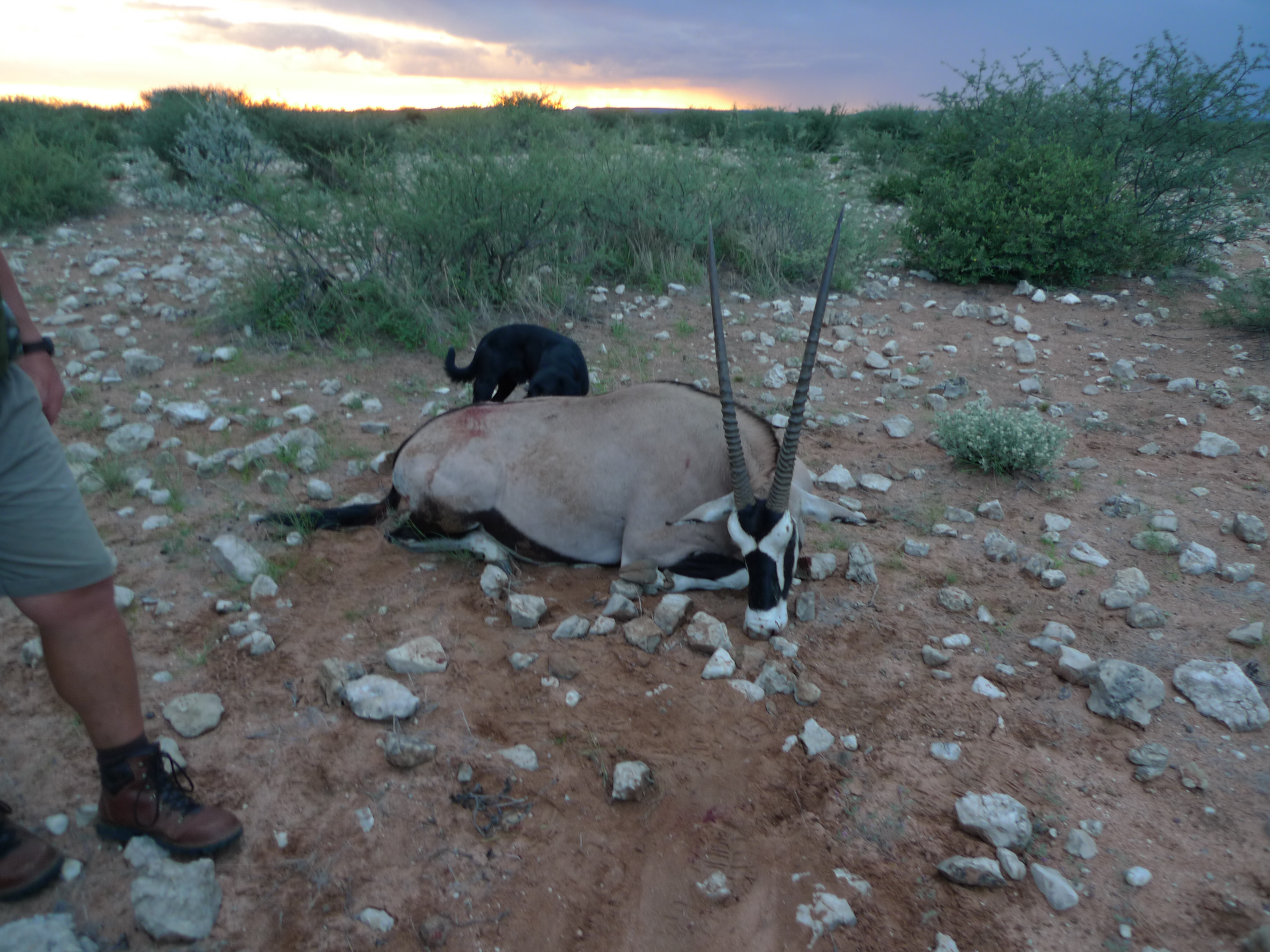 Plötsligt ser vi en ensam Oryx komma från vänster, mycket troligt den vi skrämde förut, den går på drygt 150 m men börjar plötsligt gå bortåt. Bennie undrar om jag känner mig trygg med att ta den, jag gör mig klar och tar stöd vid sidostolpen, tyvärr hinner den gå en bra bit men stannar ändå fint och den stora kroppen känns inte svår på 200 m. Jag släpper skottet som tar men troligen lite lågt för den stannar inte utan haltar halvspringande iväg, jäklar… nu är det brått vi vill inte tappa en Oryx strax innan mörkret. Jag skjuter snabbt två skott till på 250 m, ett av dom tar, den stannar och det syns blod i munnen, den lägger sig ned på drygt 300, eftersom den fortfarande är oroande pigg vill Bennie att jag fortsätter, ett skott till som tar men den reser ändå på sig och går en bit till tills den lägger sig på 390, jag håller upp ordentligt och får in ytterligare en träff, den reser sig igen och haltar upp bakom en buske på drygt 450 m där den lägger sig, vi går snabbt ned från tornet och tar oss över den öppna ytan medan den ligger och betraktar oss, inne på 100 m har jag den i siktet men bara huvudet så Bennie vill gå till höger så vi har halsen, då reser den ännu en gång på sig och brakar iväg in i buskarna, Bennie ropar på bilen med hunden som kommer på några minuter. Vi hör den igen springa en kort bit och brakande lägga sig och släpper hunden som snabbt hittar den och börjar skälla, vi springer fort fram och ser precis hunden flyga bakåt för att undvika de sylvassa hornen vilket den inte helt lyckas med.