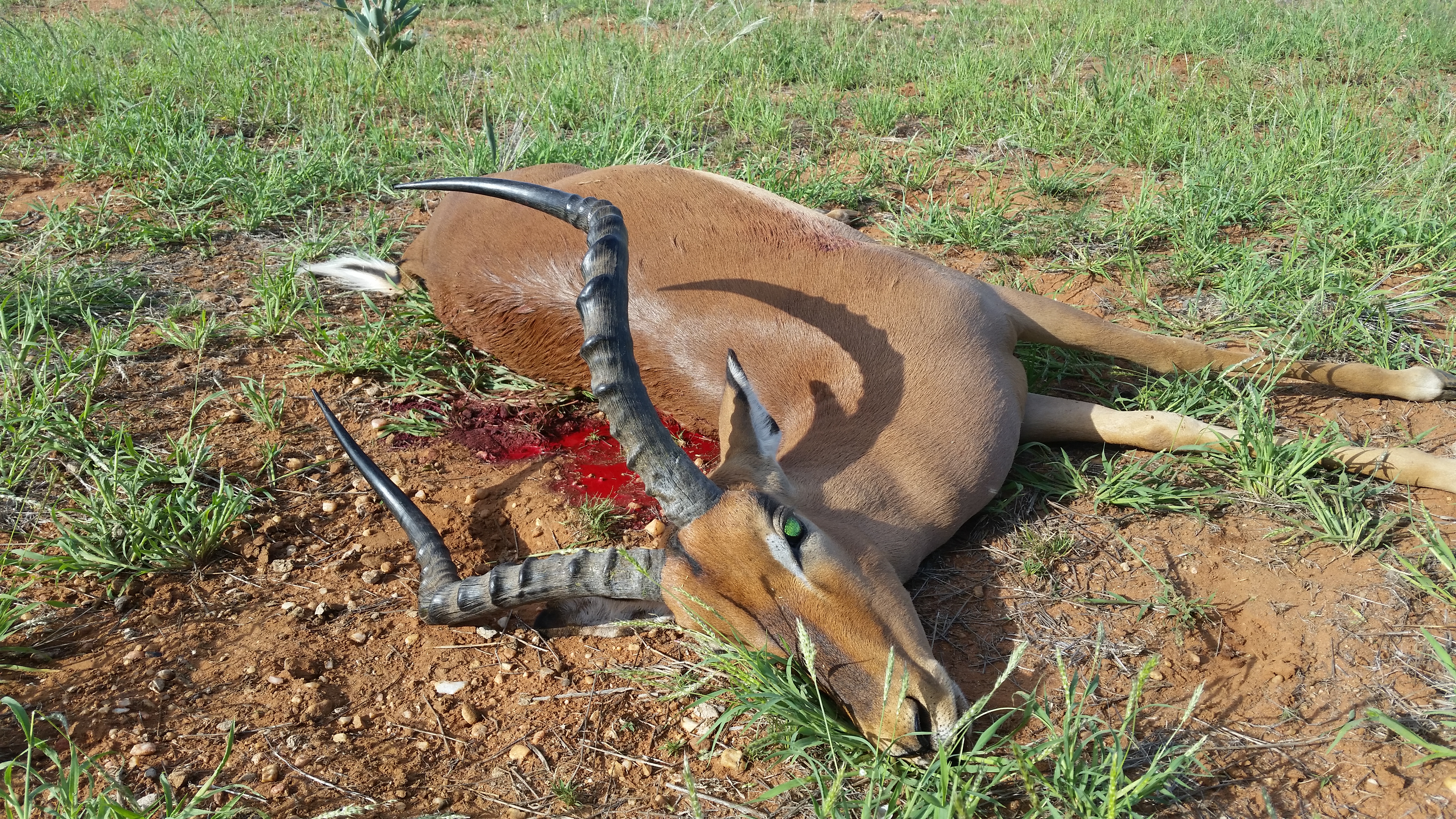 Vi stannar på en höjd med bilen så fort vi kommit in i området, snart så ser vi en Impalaflock igen och är precis på väg att gå efter dom när jag 300 m bort av en ren tillfällighet och envishet får syn på det herrgäng jag sett flera gånger tidigare men som vi inte ens kommit nära. Idag är det tre fina Impala bockar och mitt ibland dom en Bläsbuck som slagit följe, dom är troligen stötta av nåt och småspringer åt vårt håll men snett bortåt, Johan får syn på dom också och vet intiutivt direkt hur vi skall göra för att genskjuta dom. Vi sticker iväg fort, småspringer genom buskaget utan att bullra för mycket, efter bara några minuter och några hundra meter är vi nära deras uppskattade flyktväg och Johans skarpa blick får syn på dom mellan några buskar en bit bort. Han ser ut ett djur, det sista och hittar snabbt en korridor mellan några buskar. När det tredje djuret springer genom luckan är han precis uppe med stödet och beordrar mig i läge, jag osäkrar i rörelsen och lägger upp precis som den sista bocken dyker upp med sidan i luckan som inte är större än djuret och Johan visslar fast den och precis i samma sekund släpper jag också skottet. Yes! Fort och rätt….