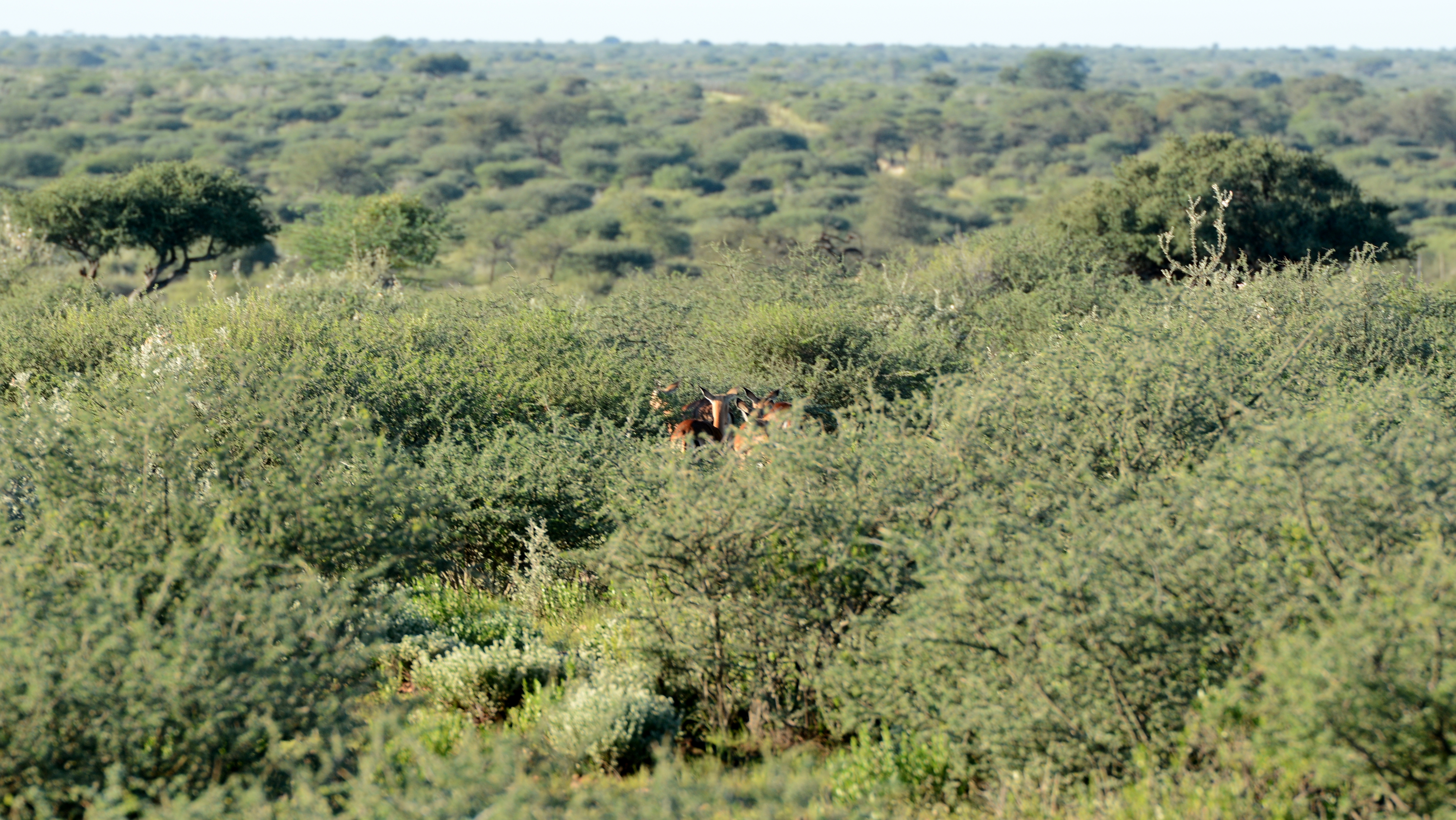 Vi överraskas av att hitta spår nästan direkt när vi åkt ut från gården, det är svårt att bedöma storleken på tjuren men en flock kudu har på morgonen gått in på slätten nära huset och troligen betat bara 300 till 400 m från frukostbordet. Vi sitter av direkt och börjar tyst smyga på de färska spåren. Det går ganska fort framåt tills Johan tvärstannar och trycker ned oss under ett träd, vi är mycket nära dom, nästan för nära. Kudu-korna är omtalade för att t.o.m. lägga ned huvudet mot marken och titta under grenar och växtlighet och spana.