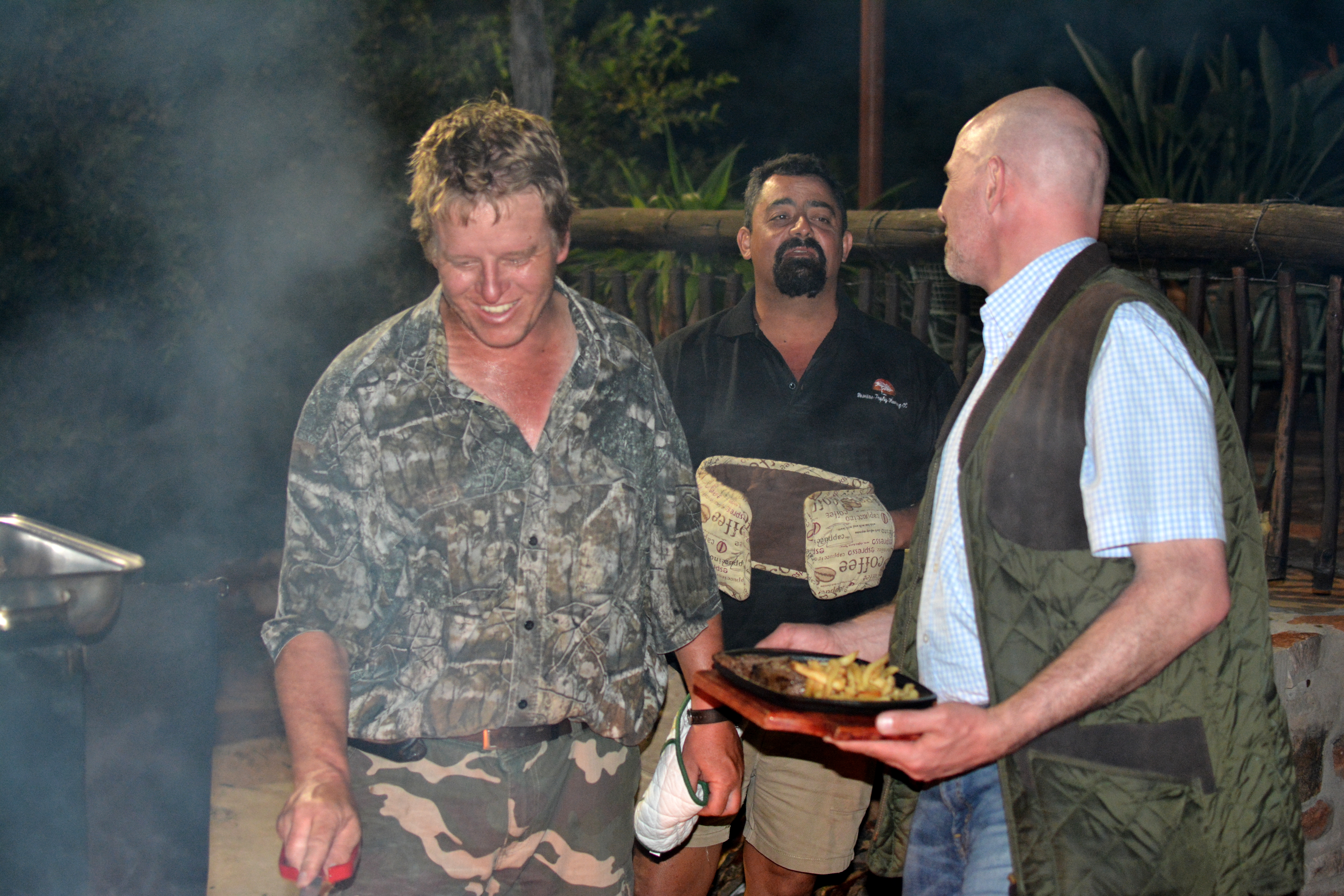 Grillmästare och barbequekungen Bennie briljerar igen ikväll och serverar helt fantastiskt kött, i lördags var Eland bäst, ikväll var det nog zebra som tog priset! Hungriga efter lång dag är det t.om tyst korta stunder när alla njuter. Tack för ytterligare en helt fantastisk jaktdag i detta underbara jaktland!