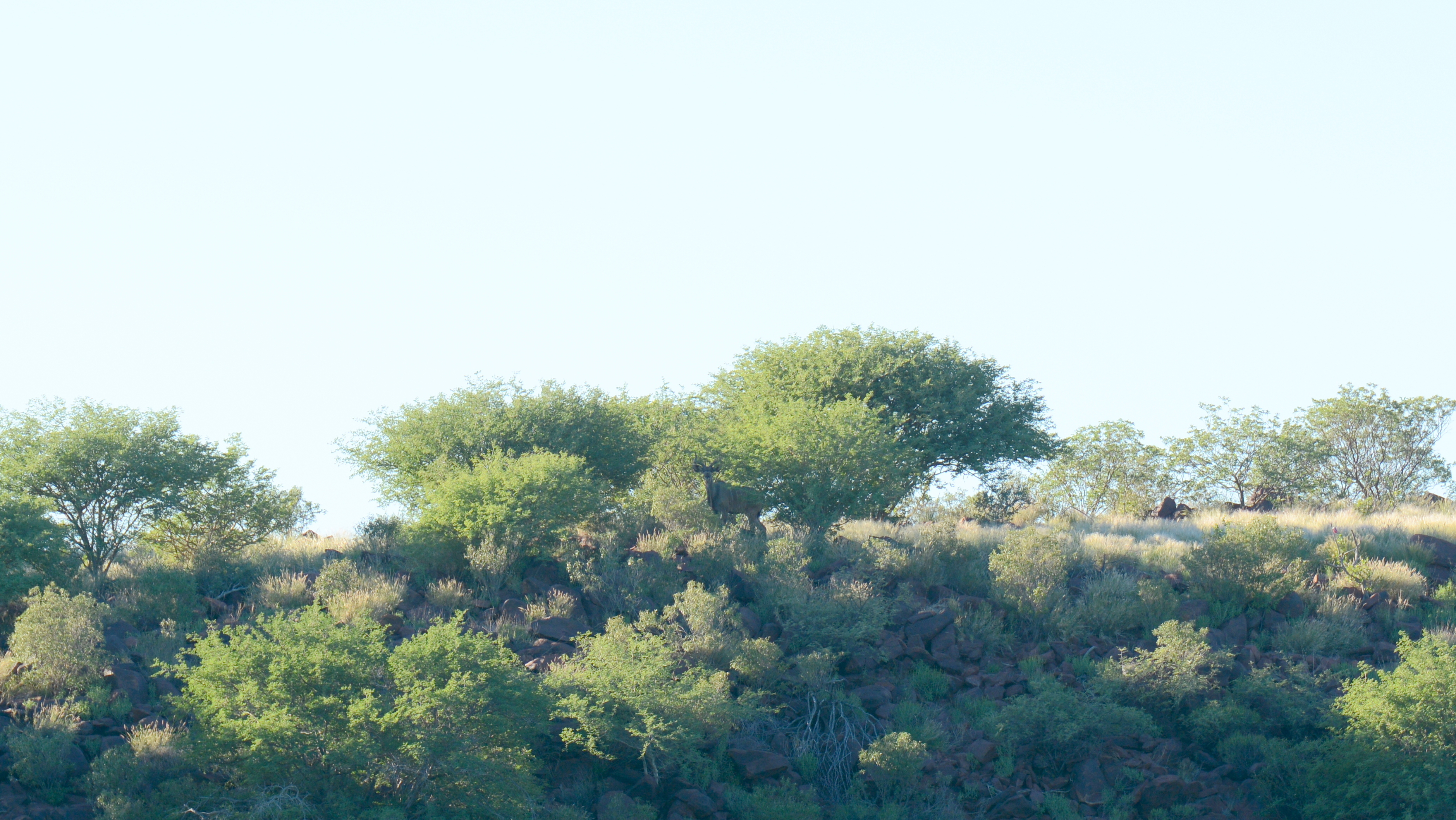 Vi ser först några kor och sen en ung tjur på 350 m som lugnt och lite kaxigt betraktar oss från en bergskam, men inget närmare och tyvärr inga spår efter någon stor kudutjur.