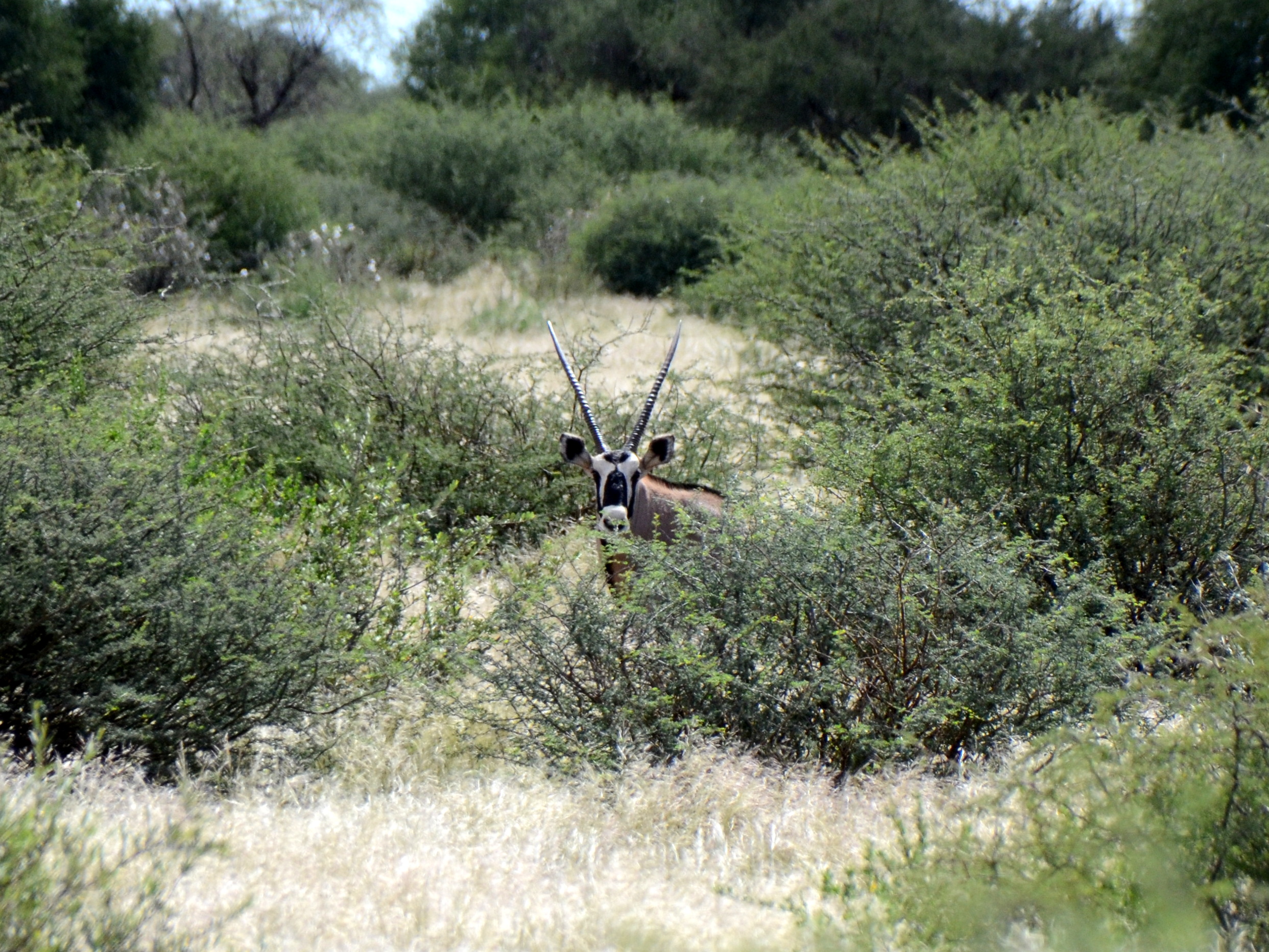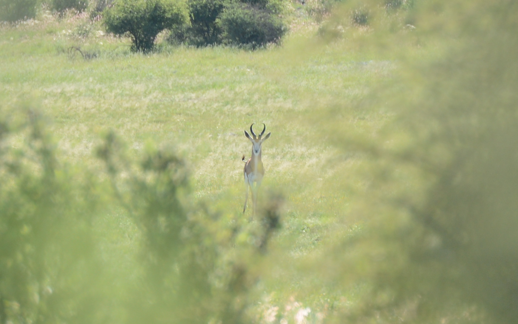 Mitt i jakten på dessa går vi också på en Oryx som lurar oss och snabbt försvinner spårlöst i vegetationen. Det kommer plötsligt en ordentlig regnskur och åskan dundrar respektfullt en bit bort. En stund senare nu nära skymmningen är vi vid ett nytt vattenhål och smyger där upp i ett torn, mellan 100 och 200 Springbuck står i bakkant och även några enstaka Bläsbuck.