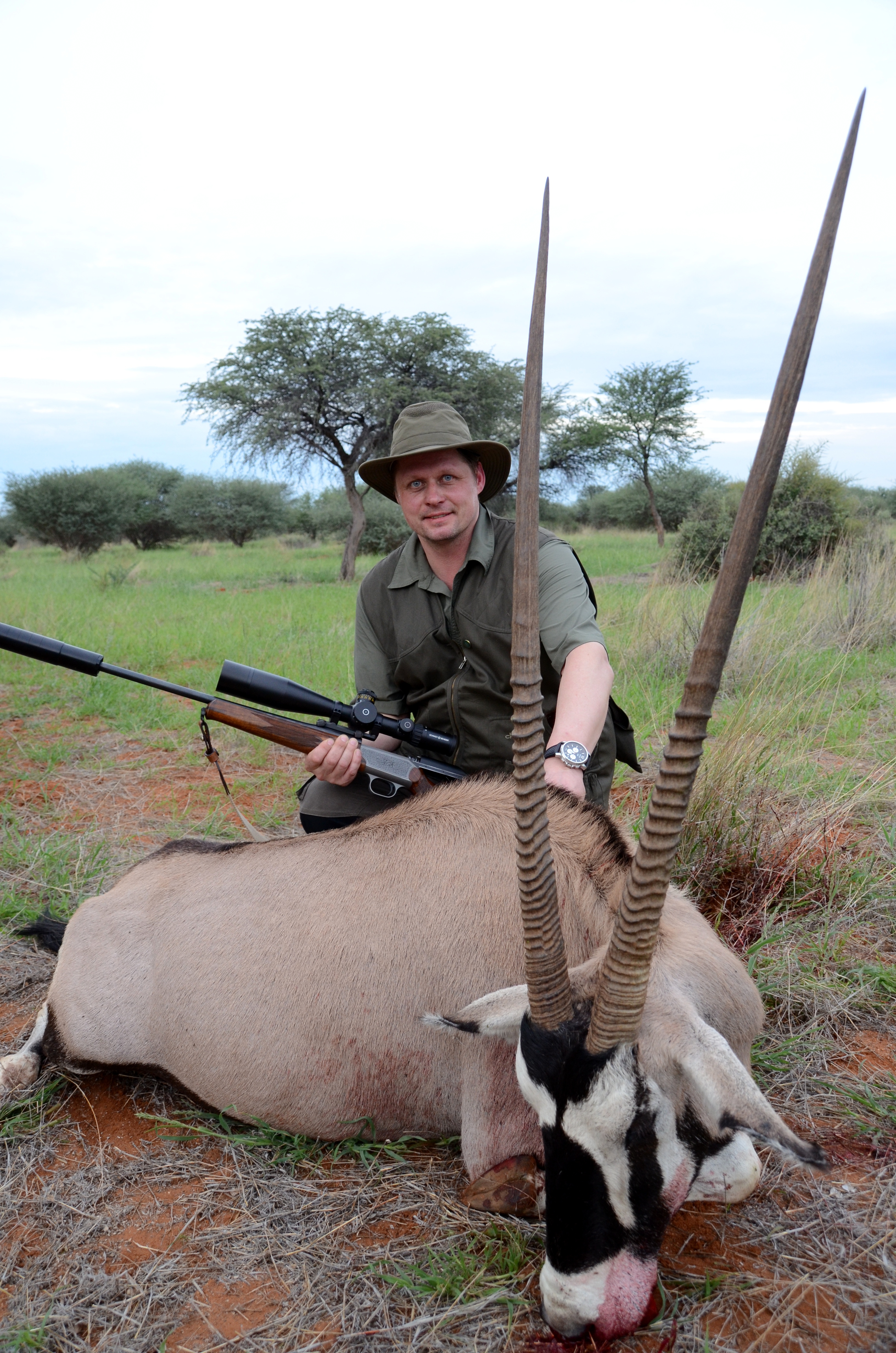 Snart har vi letat upp den stora flocken och spanar ivrigt för att se om det finns nån lämplig bock bland dom, när vi spanar som ivrigast inne på ca 100 m dyker det plötsligt upp en ensam Oryx, en gammal tjur som stötts ur sin flock då han inte riktigt räcker till längre och uppfyller kriterierna för att vara ”cull”. Johan frågar mig snabbt om jag är intresserad och jag säger ja med villkoret att det blir bra jakt. Solen ligger redan lågt och det är inte helt lätt att se konturer och djur på avstånd. Han förstår vad jag menar och vi utmanar situationen genom att smyga närmare och testa hur nära vi kan komma, från buske till buske hukar vi i en snabb ansmygningen medvetna om att det bara behövs att en enda Impala ser oss för att den skall skrämmas iväg och även ta med sig Oryxen som medvetet rör sig med dom djuren för att få fler ögon till stöd. Som tur är medger marken väldigt tyst ansmygning, sätter man fötterna bredvid tuvor och stenar är den röda sanden perfekt att smyga i. Plötsligt är vi nära där Johan såg oryxen senast och vi stannar för att vänta att den skall komma fram bakom en buske, tiden står nästan stilla, dessa stunder är dom bästa, adrenalin och fokus gör att man är helt inne i situationen. Plötsligt pekar Johan åt ett annat håll 20 m åt höger, där den dyker upp och betar på bara 40 m avstånd, den har rört på sig fortare än vad vi väntat oss och kan när som helst se oss då vi från den vinkeln står lite öppet. Johan ställer snabbt upp stödet och jag lägger upp och släpper skottet innan huvudet har rest sig från gräset. Alla Impala intill får en våldsam fart åt alla håll, oryxen tecknar och rusar efter smällen. Fredrik en bit bakom oss som inte vet att vi jagat Oryx ser förvånad att det kommer en Oryx springande och tror att den är skrämd av vårt skott på Impala. Dom kommer ikapp oss och vi går tillsammans fram till skottplatsen, det är gott om lungblod, jag för in en ny patron och går bredvid Johan efter de uppenbara och djupa flyktspåren i sanden, bara 30 m bort ligger det stora djuret. Johan ställer sig på hornen innan vi går fram för att försäkra sig att den inte gör en farlig rörelse.