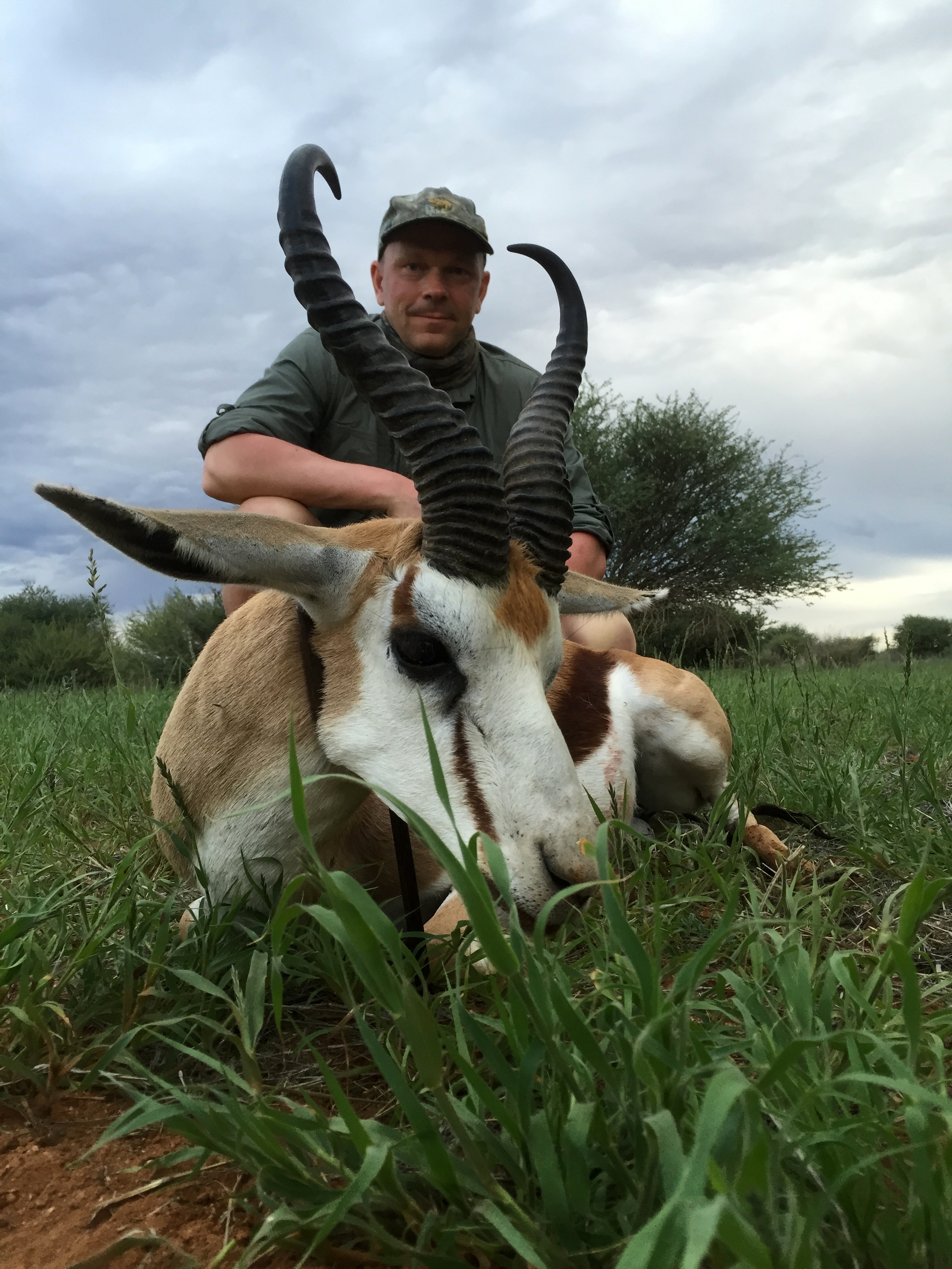 På vägen så tvärstannar Bennie plötsligt, backar och trycker tillbaks mig bakom en buske, bara 80-90 m bort ligger en jättefin Springbuck och vilar vid roten av en buske. Vi tittar försiktigt fram mellan grenarna för att inte oroa den, jag har fritt skottfält men har tyvärr inte med mig mitt skjutstöd, stående eller fritt känns lite osäkert på det avståndet, en Springbuck är bara lite större än ett rådjur och jag vill ha en bra träff, känner mig heller inte helt lugn så här 1a skottet. Bennie märker att jag inte andas helt lugnt och då det börjar bli lite brått för Springbucken anar nåt så erbjuder han mig att skjuta från hans rygg, han lägger sig snabbt ned på mage och jag tar stöd precis som djuret reser sig upp med framsidan mot oss, skottet går direkt innan den hinner börja fly och faller ihop på plats av skottet som tar lite högre än jag tänkt nära ryggraden. Vi stannar och tar det lugnt, massor av vilt runtomkring oss och det kan gott bli fler chanser så vi fortsätter att smyga sakta framåt. Mitt på den öppna ytan bakom bocken vid vattenhålet står en plötsligt en stor black wildebeest och fnyser argt åt oss på drygt 100 m. Enligt Bennie är det troligtvis den största vi kommer att se den veckan. Tankarna yr i huvudet, har jag råd med den? Den står fortfarande och fnyser med fronten mot oss för att visa sitt missnöje över vårt intrång på dess domäner, hur många sekunder har jag på mig?. Bennie har skjutstödet uppe och jag tänker ”va fa…n” lägger an siktar på stickhålet och skjuter, men känner i skottet att jag haft alldeles för brått och ryckt av skottet som passerar till höger, Bennies vana sinnen både ser nedslaget och noterar det uteblivna dova anslaget som så tydligt signalerar träff i djur. Förbannat….jag skäms och vill helst göra som strutsen…uppenbarligen lite för lättstressad och ivrig i skottögonblicket. Den ståtliga tjuren är snabbt långt borta, vi går fram för att säkra våra teorier och det är inte tillstymmelse till blod på skottplatsen. Vi tar ganska snabbt rätt på Springbucken och tar lite bilder,