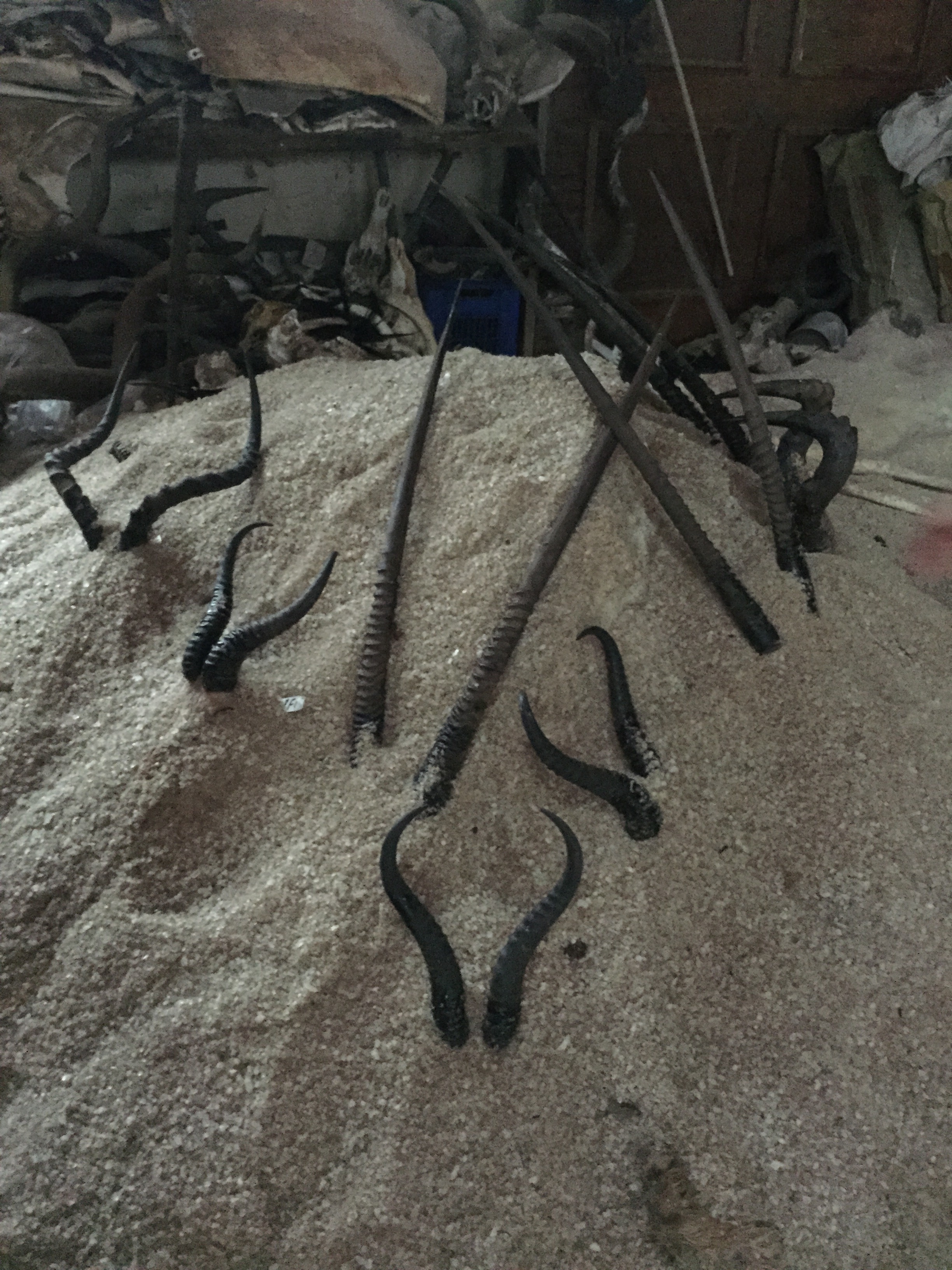 Vi återvänder för lunch och kort vila. Ett rejält regn och åskväder gör att eftermiddagens jakt ställs in och istället tar vi oss tid att mäta trofeer. Alla skallar och skinn ligger i salt. Dom mäts i längd och grovlek vid roten, det visar sig att vi redan har två guld i gruppen, Pelles Oryx och Kims Springbuck, själv har jag samlat ihop 3 silver i salthögen.