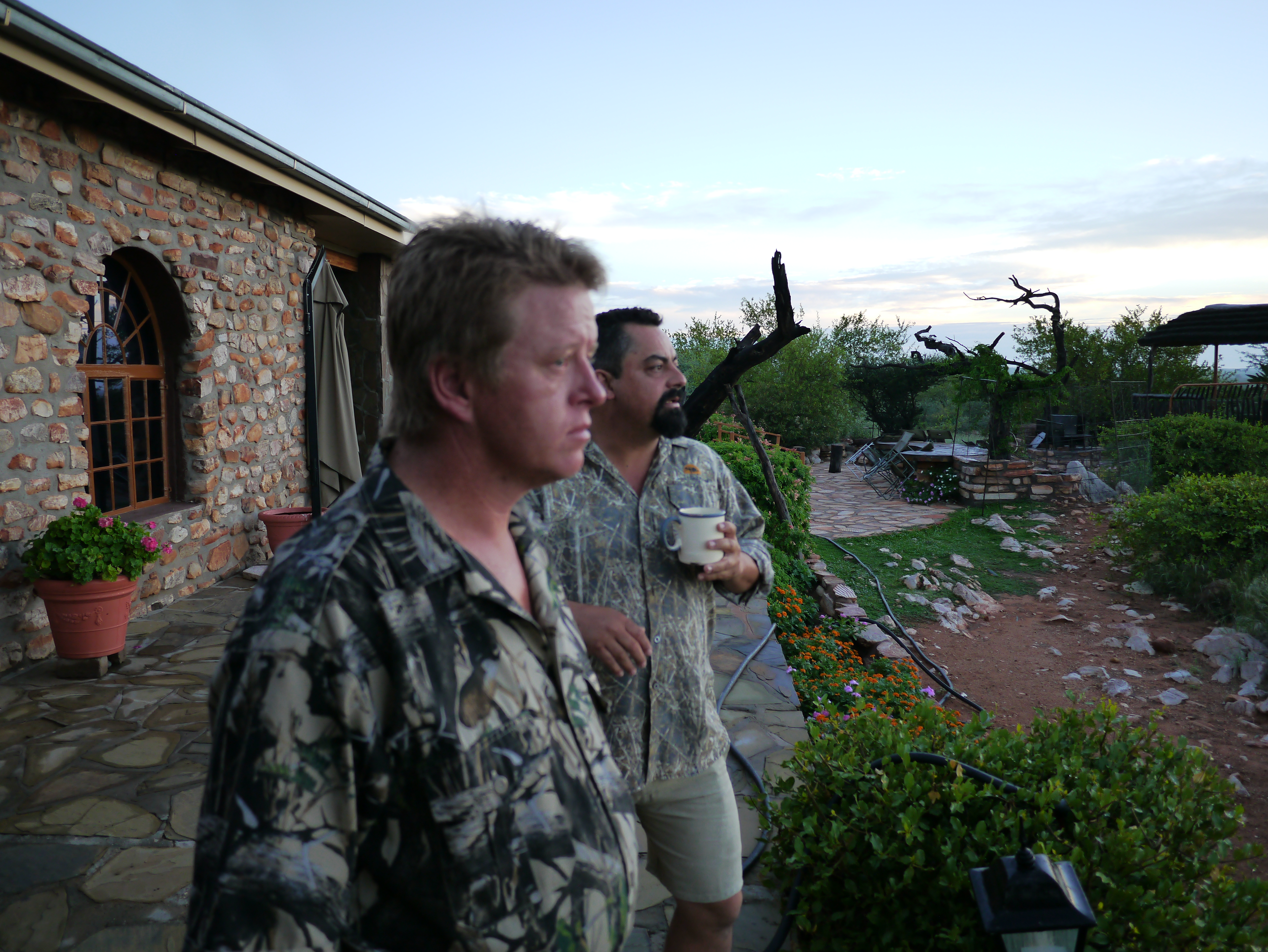 Vi sitter runt en eld i den fina trädgården på altanen och pratar om dagen medan Bennie grillar och hans fru och hennes föräldrar dukar fram. Tillsammans med familjen i tre generationer avnjuter vi sen en fantastiskt middag, vi får bl.a Eland som är det bland det absolut godaste vi ätit från en grill och då är 2 st i gänget kockar! Vi njuter av måltiden, gott vin och trevliga samtal innan kvällen blir sen och vi varvar ned framför nån drink och letar oss till rummen efter lång resa och händelsrik dag för att vara pigga i morgon då det blir full jakt!