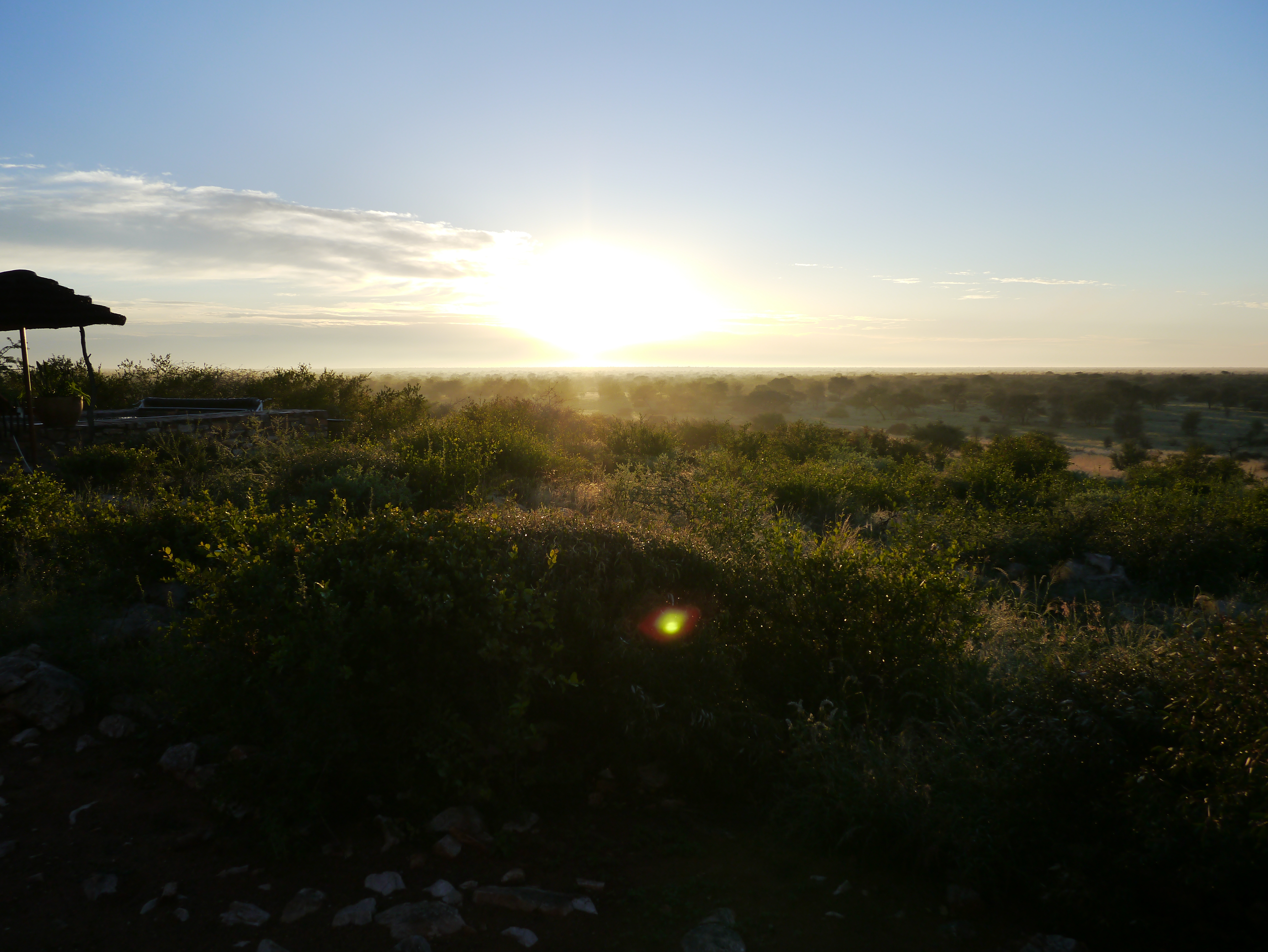 Vi blir hämtade av två av våra tre PH’s Bennie och Johan som tar oss till en god frukost inne i stan samt förbi en affär med jaktkläder där vi kompletterar lite innan vi tar fart ut mot Keerweder Farm 2 h sydöst Windhoek. Vi checkar in i fina rum i en vacker byggnad på en höjd i kanten av den ca 7000 ha stora egendomen på randen av Kalahari inte så långt från Botswana.