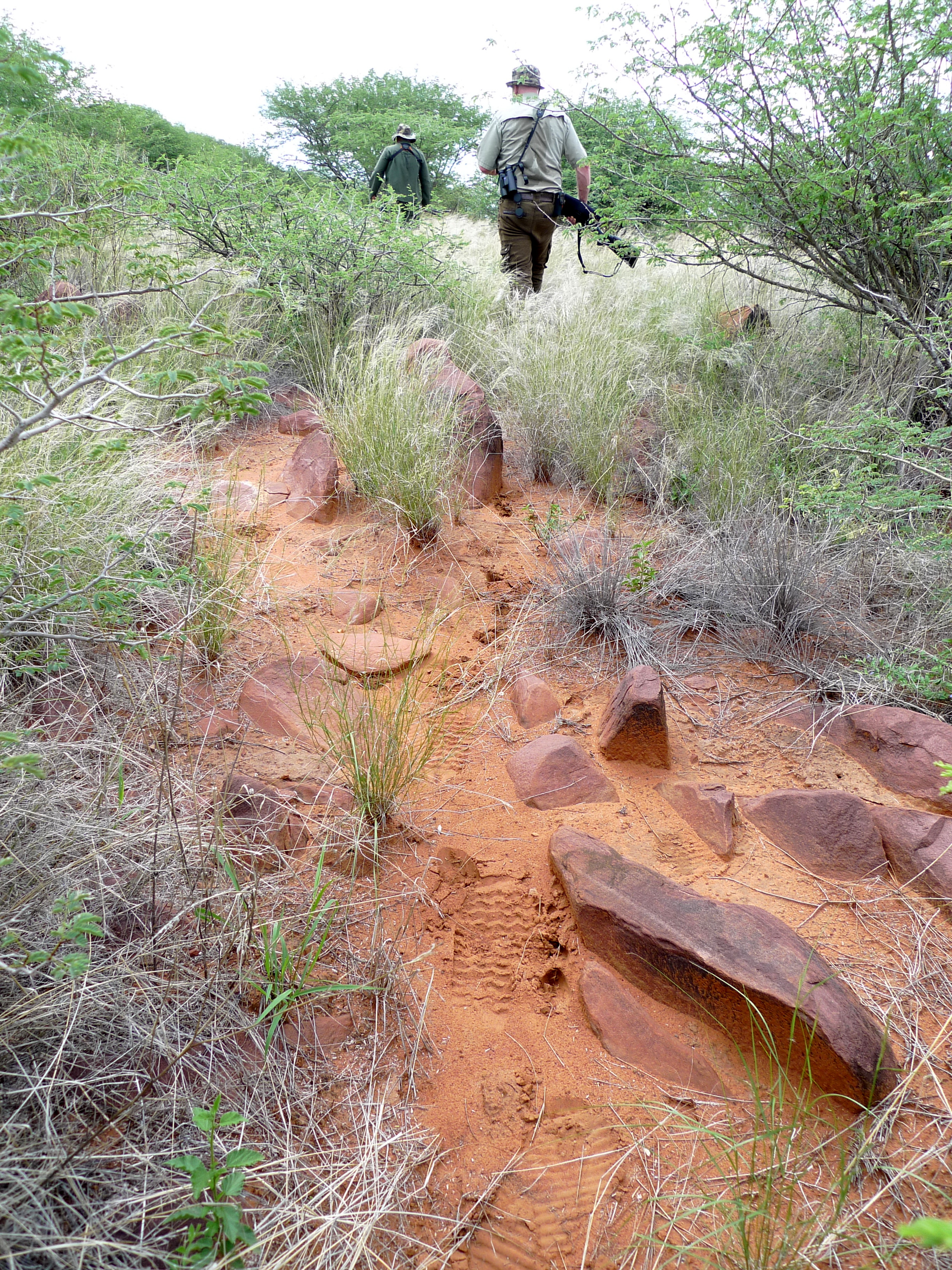 Efter nån timme är vi uppe på toppen och försöker få syn på några djur där vi har utsikt, men vi ser inget och vi inser att de djur vi spårat är alldeles för överlägsna i den terrängen för att det skall vara nån mening längre. Vi letar oss nedför bergssidan. På vägen ryser jag till lite när jag ser de stora skelettbenen som ligger i vad som uppenbarligen är en leopards tillhåll i en mindre grotta i bergssidan. Törstiga efter tufft smygande tar vi en rejäl paus vid bilen och släcker törsten ur kylväskan. Vi letar oss tillbaka längs bergssidan mot huset för en lunch och lite vila innan eftermiddagens pass.